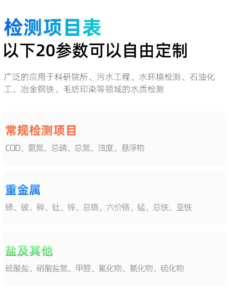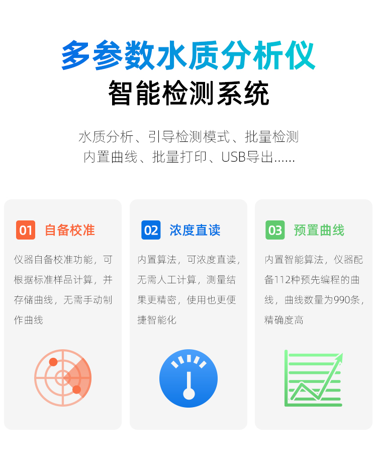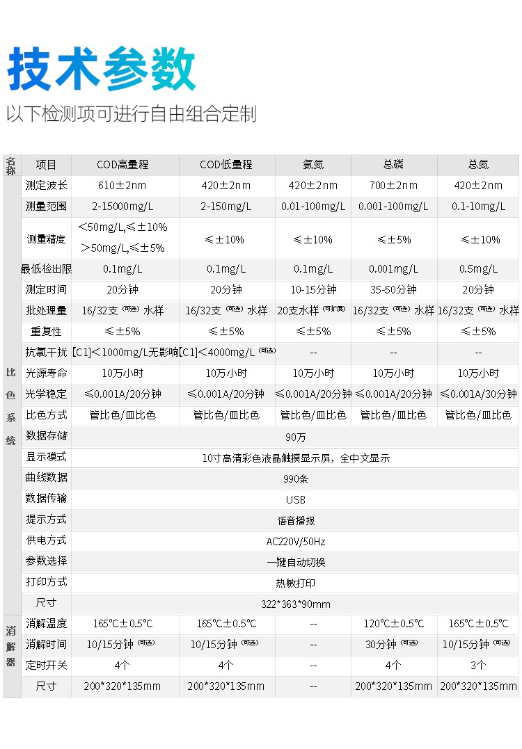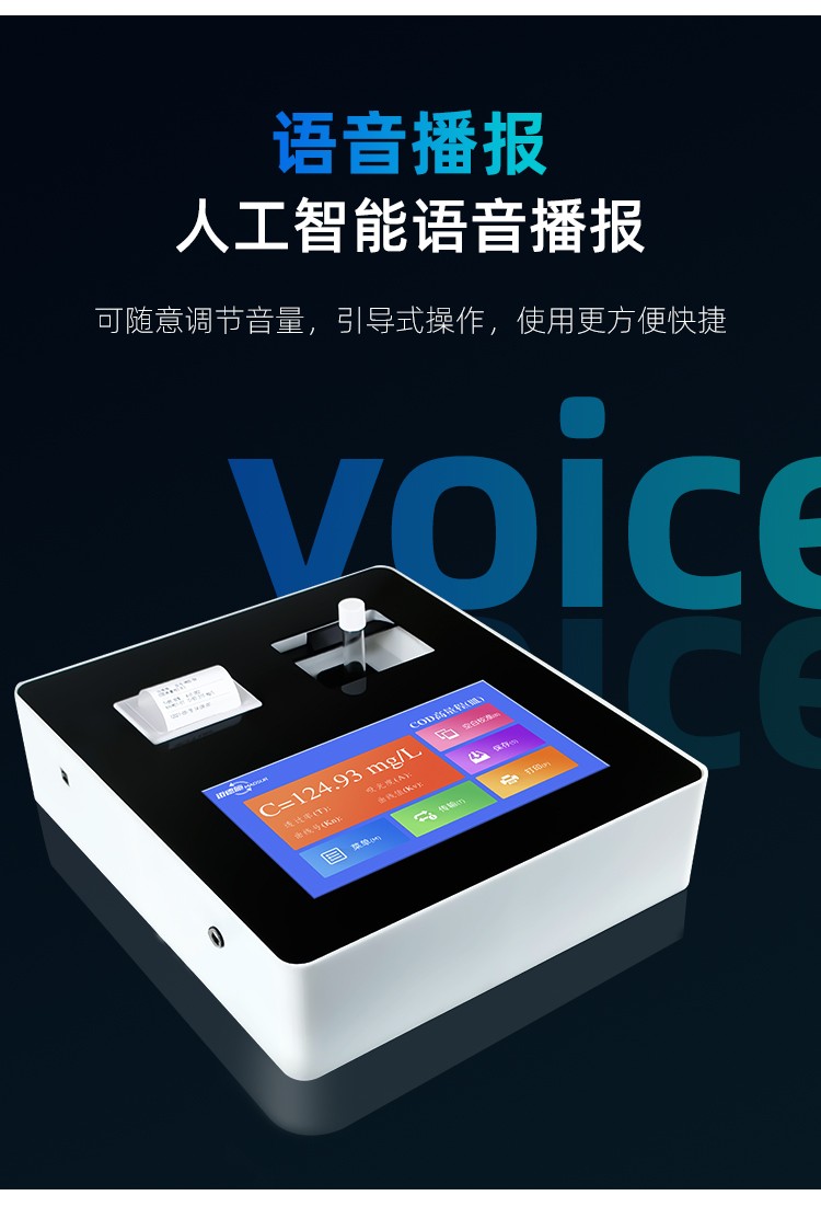 人工智能語音播報提示,可隨意調節(jié)音量, 使用更方便更 配備112種預先編程的曲線,曲線數量990條,可濃度直讀,測量結果更精密; 具有數據存儲功能,可存儲90萬組數據,并能自由查看; 10寸彩色液晶顯示觸摸屏,全中文操作模式,更便于操作掌握; 儀器自備校準功能,可根據標準樣品計算, 并存儲曲線,無需手動制作曲線; 配備USB接口傳輸功能,自帶打印機,可打印當前數據及存儲的歷史數據; 采用管比色、皿比色,雙比色系統